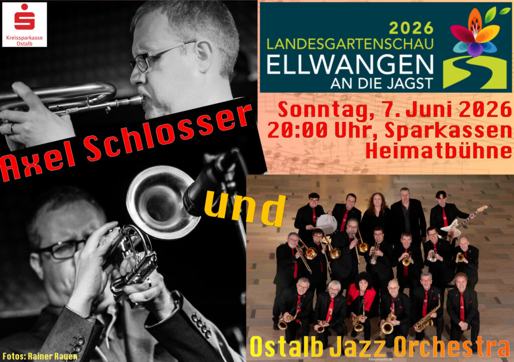 Wie schon erwähnt (hier) spielen wir am Sonntag, 7. Juni 2026, mit Axel Schlosser auf der Sparkassen Heimatbühne auf der Landesgartenschau in Ellwangen. Das Konzert beginnt um 20:00 Uhr und wird ohne Pause durchgehen, dabei ca. 80-90 Minuten dauern. Der Eintritt ist frei, allerdings muss man ein gültiges Ticket für die Landesgartenschau besitzen, um erst einmal auf das Gelände zu kommen, z.B. eine der äußerst beliebten Jahreskarten, von denen bereits über 33.000 Stück verkauft wurden – wow! Hier finden Sie weitere Informationen über Ticketpreise und -verfügbarkeiten (wir haben mit dem Verkauf der Eintrittskarten nichts zu tun, können also auch keine Karten „besorgen“).