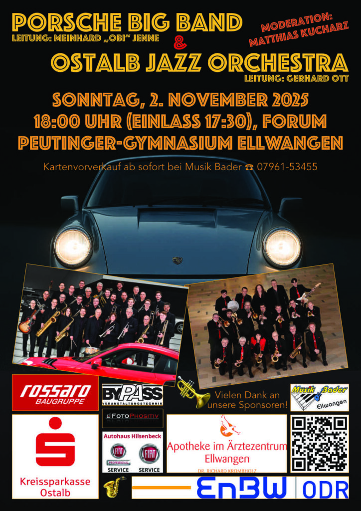 Es sind nur noch fünf Wochen, dann spielen wir, das Ostalb Jazz Orchestra, mit der Porsche Big Band im Forum des Peutinger-Gymnasiums in Ellwangen. Einlass ist um 17:30 Uhr, das Konzert beginnt mit der Porsche Big Band um 18:00 Uhr, die ca. eine Stunde spielt, es folgt eine Pause, in der Sie Getränke und Speisen erwerben und verzehren können, dann spielen auch wir ca. eine Stunde.
